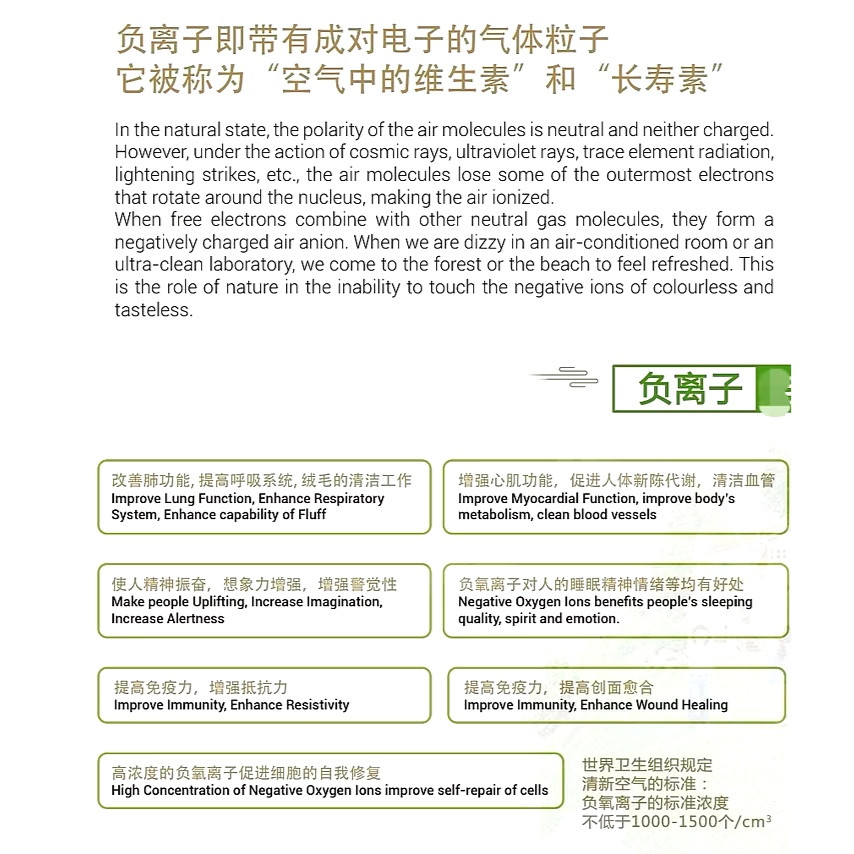 • Negative Oxygen ions benefits people's sleeping quality, spirit and emotion.